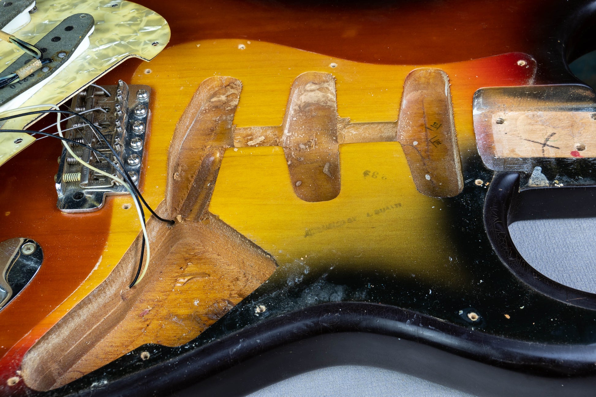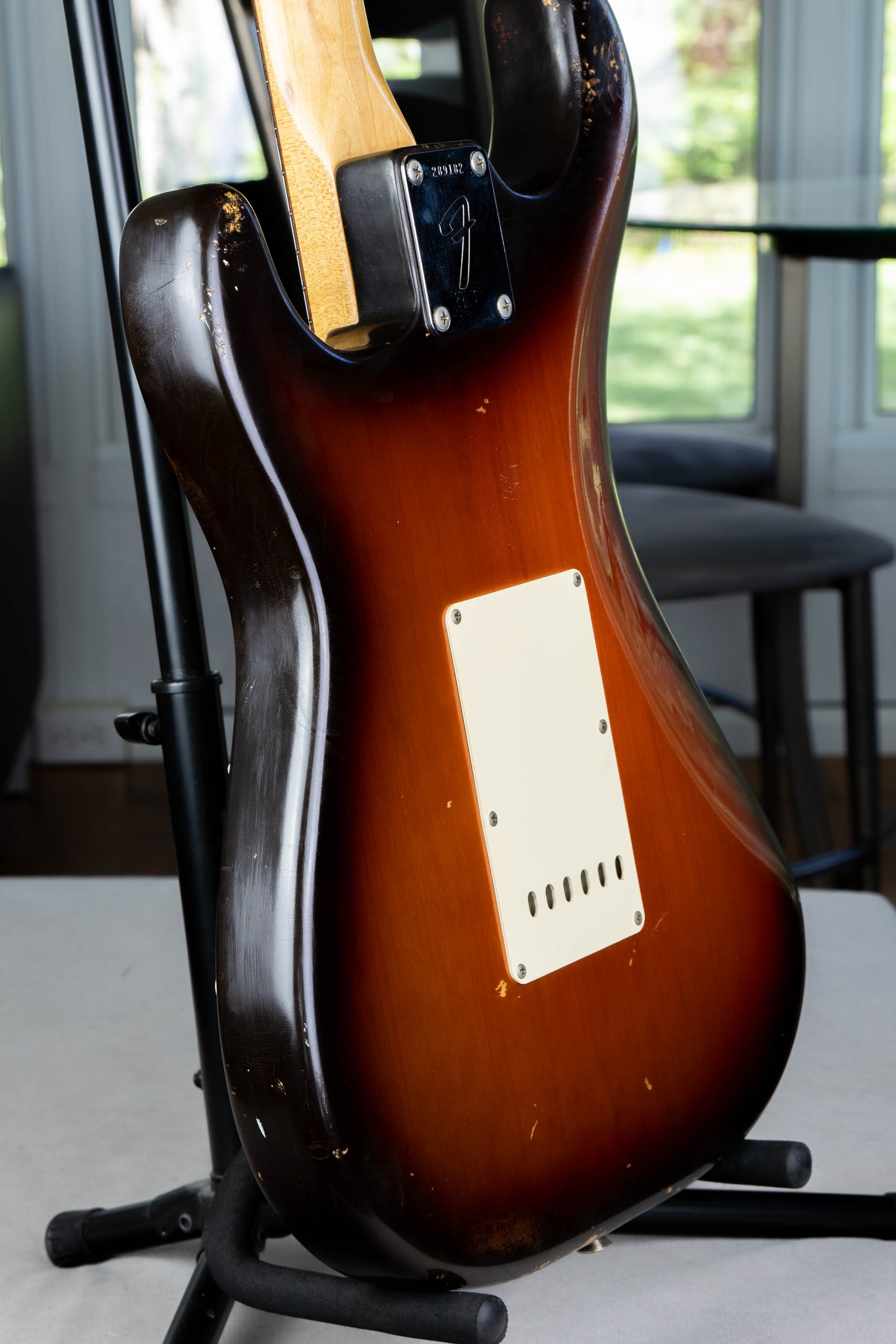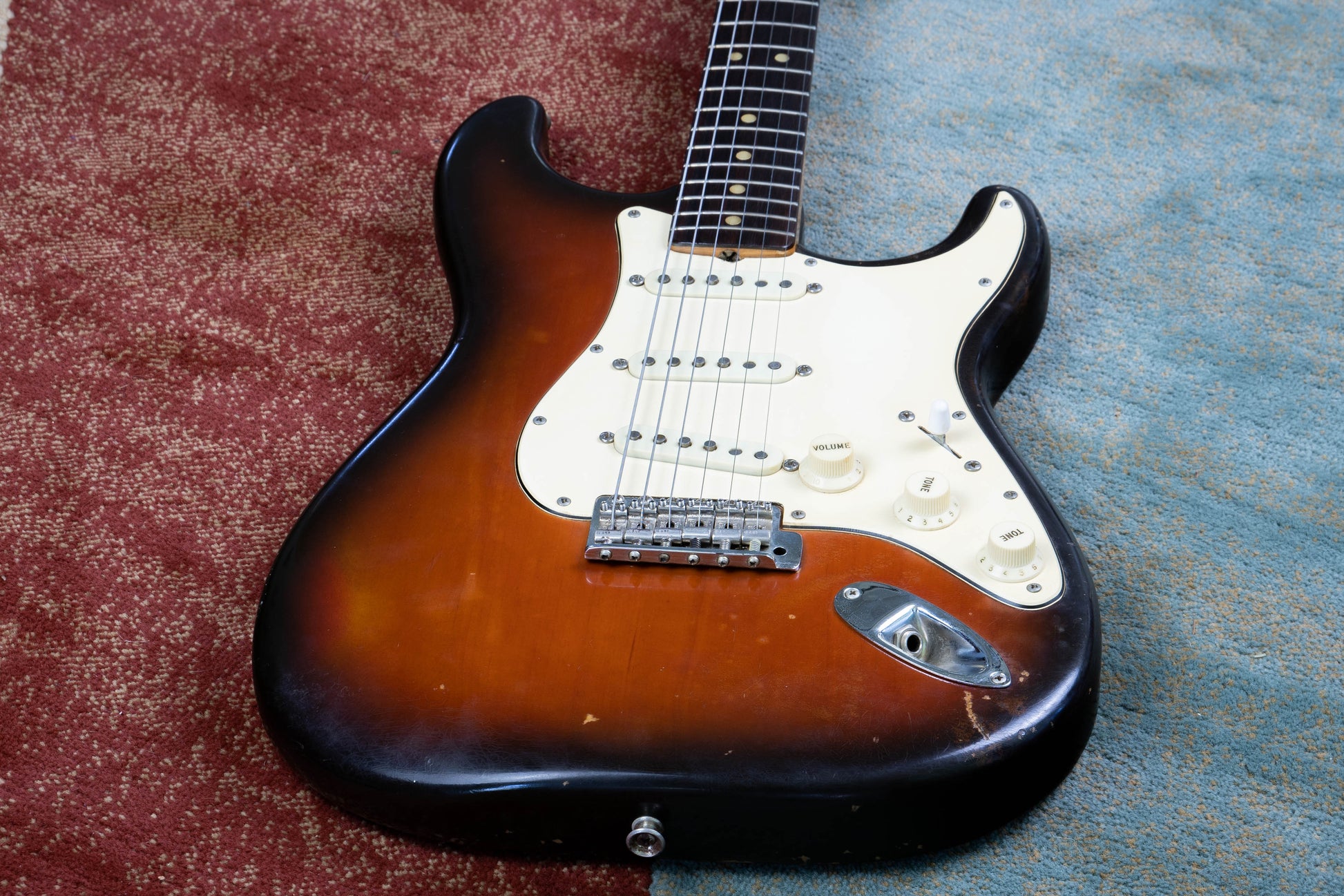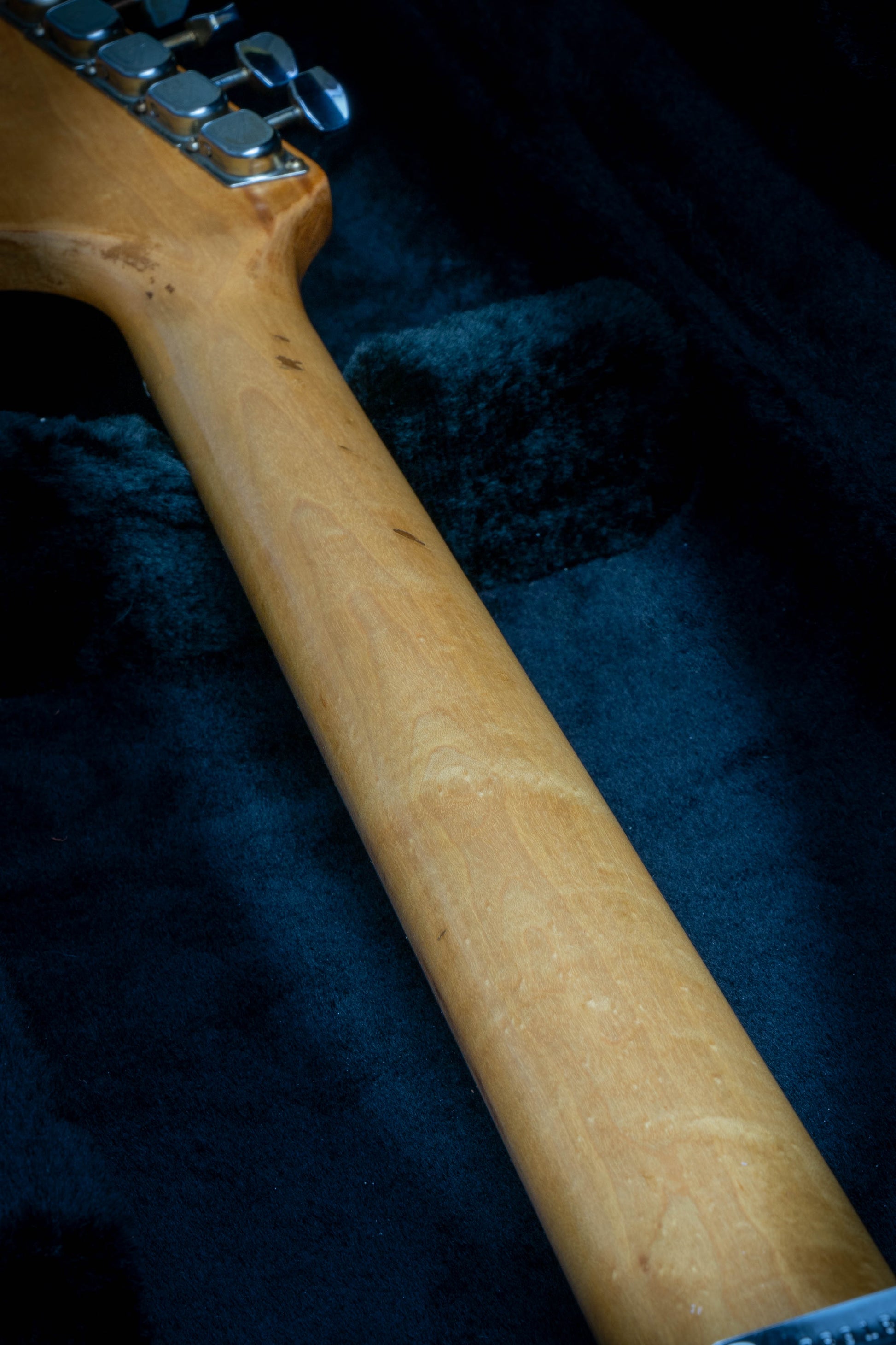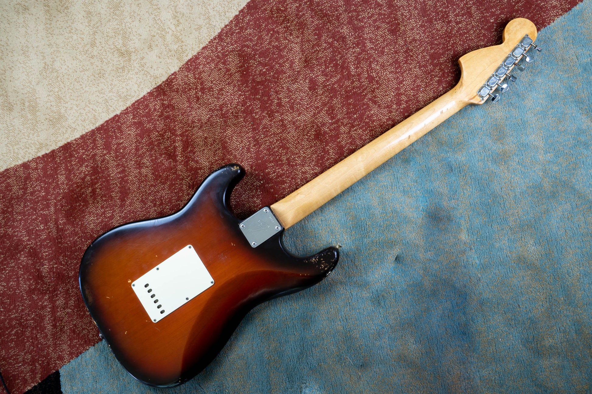 When you pick this strat up you will notice it's got a perfect '69 "U" shape neck that fits your hand like a glove made out of a bright and snappy slab of maple. On top sits a perfectly straight and incredibly beautiful, dark, and delicious, rosewood board. This neck is perfectly straight with no hump, twists or any type of distortion. Its got original small vintage frets that are perfectly level and allow for maximum playability. (Yea thats right, 2.5/64" action with no buzzing. crazy right.) The setup is absolutely perfect and this strat plays like butter. Attached to this perfect neck is a perfect, lightweight (7.13lbs), kick ass piece of alder. Its got an extremely thin original nitro finish that has all its battle scars to prove its worthiness. Overtime, the sun exposure has sucked the red out of the finish and turned the sunburst into a glowing and golding tan hue that matches its nitro headstock. The original plastics have aged to a cream color that all match and really add to it's character. This is a perfect players grade strat thats retained all its originality but has all the battle scars that make it super functional and feasible. Its got the most awesome setup ever and will provide for its owner for years to come.