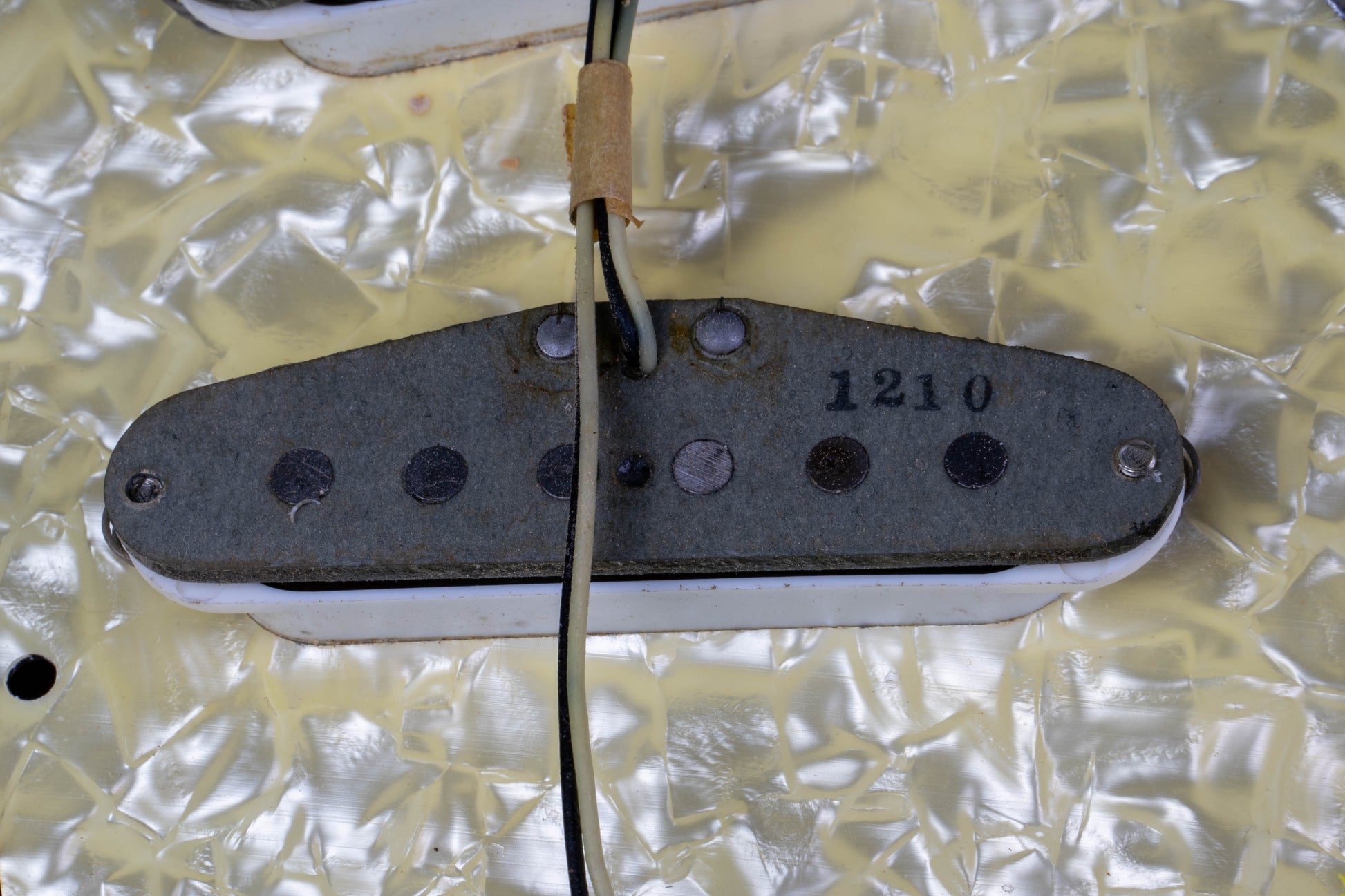 Bridge: Original 2 piece tremelo block, 6-saddle bridgeplate with one piece fender pat pending stamped nickel saddles